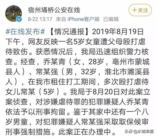 记者注意到,8月22日,宿州市埇桥区警方已对该案件进行了通报。通报称,乔某青(女,28岁,亳州人)、常某强(男,32岁,淮北人),在宿州市租住打工期间,多次殴打虐待女儿常某(5岁)。公安部门于8月20日对此立案侦查,对涉嫌虐待罪的犯罪嫌疑人乔某青依法予以刑事拘留。鉴于其家中还有一个八岁男童,对犯罪嫌疑人常某强采取取保候审刑事强制措施。目前,此案正在办理中。